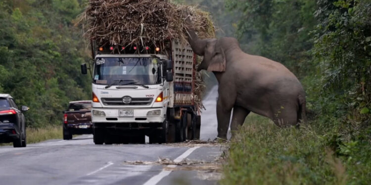 Un elefant lacom și leneș a învățat că e mai ușor să-și procure hrana din camioanele care transportă trestie de zahăr decât să culeagă frunze din junglă, așa că și-a făcut un obicei din a ieși pe stradă și a vâna mașinile care transportă ceva bun de mâncare, transmite Actual.md cu referire ladeschide.md.
